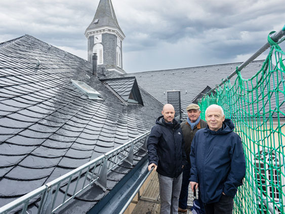 Von den alten Faserzementplatten gingen Gesundheitsgefahren aus, daher arbeiteten die Handwerker unter besonderen Schutzvorkehrungen und endsorgten das Material als Sondermüll. Weil das Gebäude unter Denkmalschutz steht, kam für die Erneuerung ausschließlich Naturschiefer infrage. Verlegt wurde dieser von Firma Theo Fetz aus Welschneudorf in der sogenannten „altdeutschen Deckart“, die durch unterschiedlich große Platten ein besonders lebendiges und traditionelles Erscheinungsbild erzeugt.