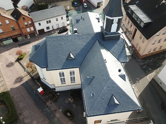 Mit einer neuen Schiefereindeckung ist das gemeinsame Dach der Evangelischen Kirche in Selters und ihrer kommunalen Seitenflügel umfassend erneuert worden. Auf rund 700 Quadratmetern wurde die alte Dacheindeckung aus Kunstschiefer abschnittsweise entfernt und durch hochwertigen Naturschiefer aus Spanien ersetzt.