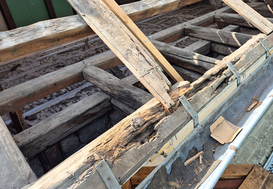Schäden am Holz, hier am Traufpunkt des Dachstuhls.