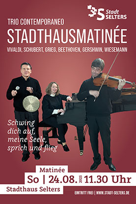 StadthausmatinéeKlassische Musik am Sonntagmorgen bieten Veranstaltungen in der Reihe "Stadthausmatinée", die sich auch zur Aufgabe gemacht hat den Sauter-Flügel des Stadthauses zum Klingen zu bringen. AusblickAnstehende Konterte finden Sie im Kalender der Stadt Selters Rückblick
